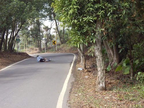 這一路上跌跌撞撞的,好幾次都差點因為忘記脫卡摔車,不過該來的似乎還是要來,到了下坡之後的髮夾彎,GLAND停下來拍照,我也跟著停下來,下個彎道,GLAND也停下來,拍張照片,我則是轉頭要跟GLAND說"你要拍照嘛"的時候,發現他根本沒跟過來,這時候耳機剛好掉去地上(忘記夾起來),忘記自己穿卡踏的我,按了煞車要撿耳機,(照片上可以看到我往下看的地方有一條黑線) 啊!!!!的一聲,兩腳都卡在踏板上就路倒了(此時耳機還是在地上)