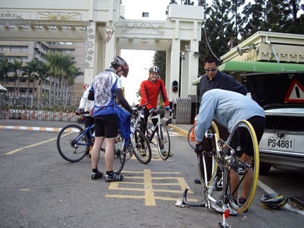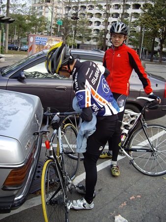 早上七點,白菜就準時來我家拿車,我們三個到興大門口的時候,辰芳早就在門口等了,過沒幾分鐘,有一台賓士對我們按喇叭,本來想比中指的,結果發現是ADSL搭爸爸的車。接著大家就幫ADSL組車,然後ADSL開始換裝,剛認識ADSL的時候,還是個很純樸的人,今天全套裝備上身之後,氣勢完全不一樣,原本被yukon封印住的能量,要完全發揮出來海放眾人惹~~