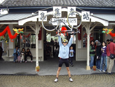 集集火車站,gland使出他最拿手的擺陣,將兩台車排好,照幾張,我則是很想在車站前,舉車,一直在想抓哪裡比較好出力,最後終於找到了,就跟gland講我要去舉車,反正沒人認識,舉完快閃,結果我幫gland拍時把相機拿歪了,抱歉啦~